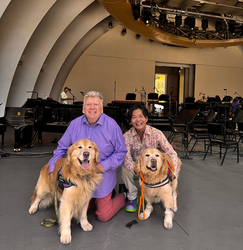 Creative Team![]() George Daugherty and David Ka Lik Wong onstage at The Hollywood Bowl, July 2025, with their two beloved golden traveling companions Charley (right) and Buddy (left).